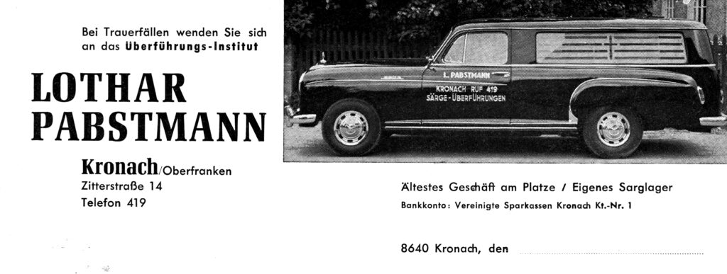 Lothar Pabstmann gründet das Bestattungsinstitut in Kronach und erhält von der Stadt die Zulassung als Bestattungsunternehmen – ein mutiger Schritt zur damaligen Zeit. Damit beginnt eine über 75-jährige Geschichte im Dienst der Menschen.